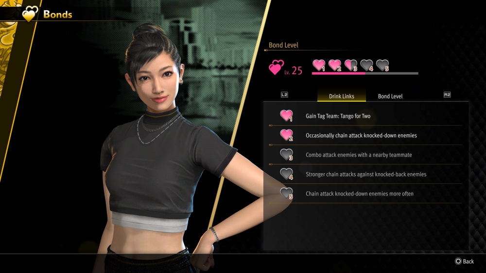 ตัวละครเพื่อน ๆ จะมีค่าสเตตัสที่เรียกว่า Bond Levels ไว้บอกระดับความสัมพันธ์กับคาสุกะและคิริว เมื่อค่า Bond Levels มีมากถึงระดับที่กำหนด จะสามารถเปลี่ยนอาชีพใหม่หรือมีท่าพิเศษใหม่ ๆ ได้