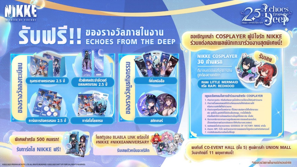 เตรียมตัวให้พร้อมกับประสบการณ์สุดพิเศษที่สาวก NIKKE ห้ามพลาด! ภายในงาน “NIKKE 2.5 Anniversary: ECHOES FROM THE DEEP” แฟนเกมจะได้สัมผัสกับบรรยากาศสุดล้ำ พร้อมกิจกรรมสนุกๆ มากมายที่ออกแบบมาเพื่อผู้บัญชาการโดยเฉพาะ ไม่ว่าจะเป็นการทำภารกิจล่ารางวัล ลุ้น Lucky Draw สุดพิเศษ รับของที่ระลึกลิมิเต็ด โพสต์รูปสนุกๆ บนโซเชียล หรือแสดงพลังคอสเพลย์ในแบบฉบับของนิกเกะตัวโปรด!