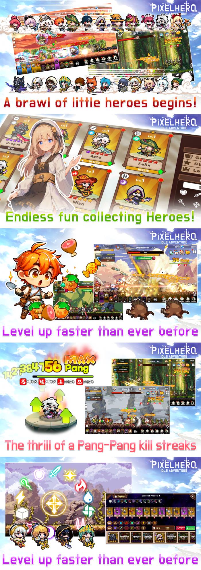 Pixel Heroes Idle เกมมือถือ Idle RPG รวบรวมฮีโร่ที่ไม่เหมือนใคร จัดทีมทั้งหมด 12 คน ตะลุยดันเจี้ยนแสนสนุก มีระบบการต่อสู้ออโต้ อัปเกรดสกิลระหว่างการผจญภัย ความน่าสนใจของเกมนี้คือกราฟิกพิกเซล และการรวบรวมทีมฮีโร่ ต่อสู้รวดเร็วปานสายฟ้า และระบบการเติบโตที่ไม่มีที่สิ้นสุด