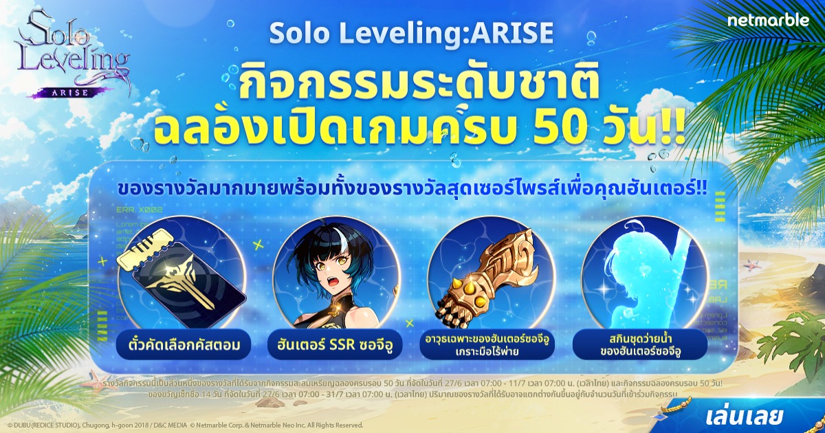 กรุงเทพฯ, ประเทศไทย (วันที่ 28 มิถุนายน พ.ศ. 2567) – เน็ตมาร์เบิ้ล ผู้พัฒนาและให้บริการเกมมือถือคุณภาพสูงชั้นนำ ประกาศถึงอัปเดตใหม่สำหรับ Solo Leveling: ARISE เพื่อเฉลิมฉลองครบรอบ 50 วัน นับตั้งแต่เกมเปิดให้บริการทั่วโลก ผู้เล่นสามารถสนุกสนานไปกับหลากหลายกิจกรรมในเวลาจำกัดที่จะมอบรางวัลอันล้ำค่ามากมายพร้อม ๆ กับการอัปเดตคอนเทนต์