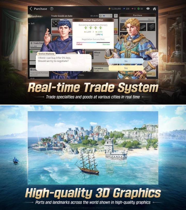 โดยเกมนี้ถูกสร้างขึ้นโดยยึดตาม IP ของเกม Open-world ชื่อดังอย่าง ‘Uncharted Waters 2’ ซึ่งมาพร้อมกับกราฟิกระดับสูงจากขุมพลัง Unreal Engine 4 ถ่ายทอดภาพเรือสินค้า , ท่าเรือและวัฒนธรรมอันหลากหลาย อาทิ ตึกรามบ้านช่อง และ เครื่องแต่งกายในช่วงยุคกลาง หรือ ศตวรรษที่ 16 ออกมาได้อย่างอลังการ