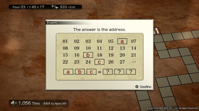 ช่องที่มีตัวเลขหรือตัวอักษรสีขาว – โดยช่องเหล่านี้ถือว่าเป็นช่องที่มีประโยชน์ต่อผู้เล่นอย่างมาก ซึ่งตัวเลขแต่ละช่องก็จะมีความหมายที่แตกต่างกัน เช่น 01 ลงไปชั้นต่อไป, 02 ขึ้นไปชั้นก่อนหน้า, 03 จัดการ Ability, 05 ชุบชีวิต, 06 ฮีล เป็นต้น นอกจากนี้บางช่องก็ยังมีไอเทมให้ผู้เล่นได้เก็บไปใช้งาน หรืออาจจะมีปริศนาคำใบ้ให้ผู้เล่นได้ขายเพื่อรับรางวัลพิเศษก็เป็นได้ โดยช่องเหล่านี้ผู้เล่นจะต้องกดปุ่มตอบรับเสียก่อนจึงจะสามารถใช้งานช่องนี้ได้