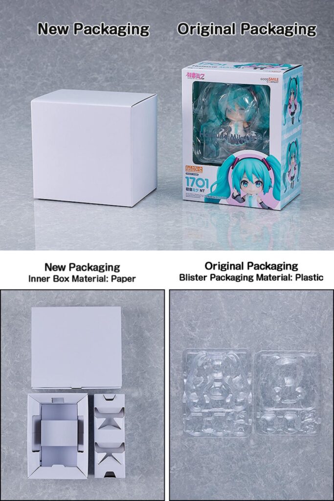 แพคเกจรูปแบบใหม่จะพบว่ามีขนาดที่เล็กลงประมาณ 20% โดยจะใช้วัสดุห่อเป็นกระดาษทั้งหมดทั้งด้านนอกและใน นอกจากนี้จะไม่มีการเจาะกระดาษด้านหน้าเพื่อให้เห็นสินค้าด้านในแล้ว และจะเป็นการพิมพ์ลายทั้งหมด คาดว่าเมื่อปรับใช้สำเร็จจะลดการใช้พลาสติกได้ที่ 84% และนอกจาก Nendoroid ทั้งสี่รุ่นข้างต้นแล้ว หากมี Nendoroid ที่ยังอยู่ในการไลน์การผลิต ก็จะเริ่มเปลี่ยนกล่องใหม่ให้กับรุ่นเก่าๆ ตั้งแต่ล็อตเดือนพฤศจิกายนนี้เป็นต้นไป เช่นเดียวกับรุ่นรีปรินต์