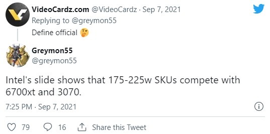 ในตอนนี้มีข้อมูลออกมาเปิดเผยว่าตัวการ์ดจอจะมีค่า TDP อยู่ที่ประมาณ 175 – 225W โดยที่ข้อมูลดังกล่าวถูกเปิดเผยออกมาจากผู้ใช้งาน Twitter ที่ชื่อว่า @greymon55 นอกจากนี้เขายังได้เผยอีกว่า ตัวการ์ดจะมาแข่งขันกับ RTX 3070 และ RX 6700 XT ซึ่งถ้าจะให้ว่ากันแล้วมันเป็นเรื่องแปลกหรือไม่ คงต้องบอกว่าไม่สาเหตุมาจากการที่ทาง Intel เองก็คาดหวังที่จะให้เป็นเช่นนั้นอยู่แล้ว