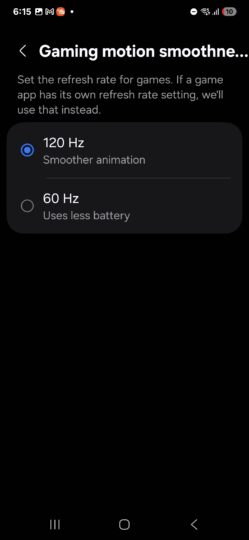 หนึ่งในตัวเลือกใหม่นี้มีชื่อว่า Gaming motion smoothness ซึ่งช่วยให้ผู้ใช้ Galaxy S25 สามารถเลือกโหมดระหว่าง 120Hz และ 60Hz ได้